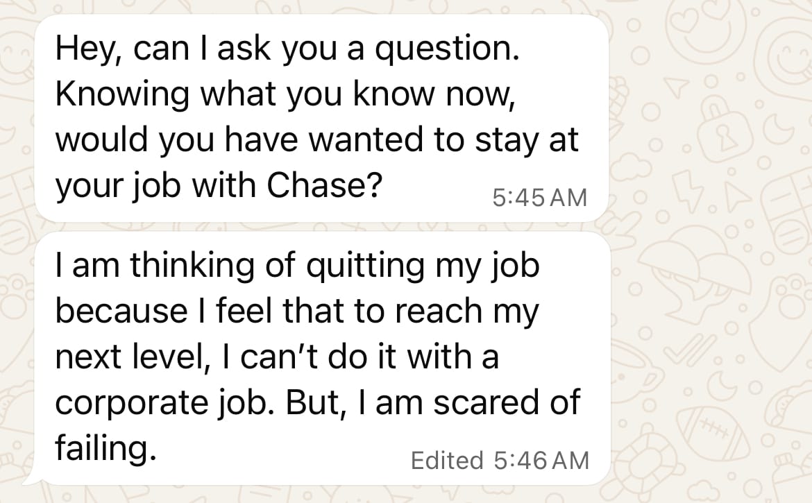 Yet when I look at my life — getting into my Porsche, writing this next book with a contract and a publisher, spending my days doing what I love — I know none of this would have happened if I had gotten that job at Chase.